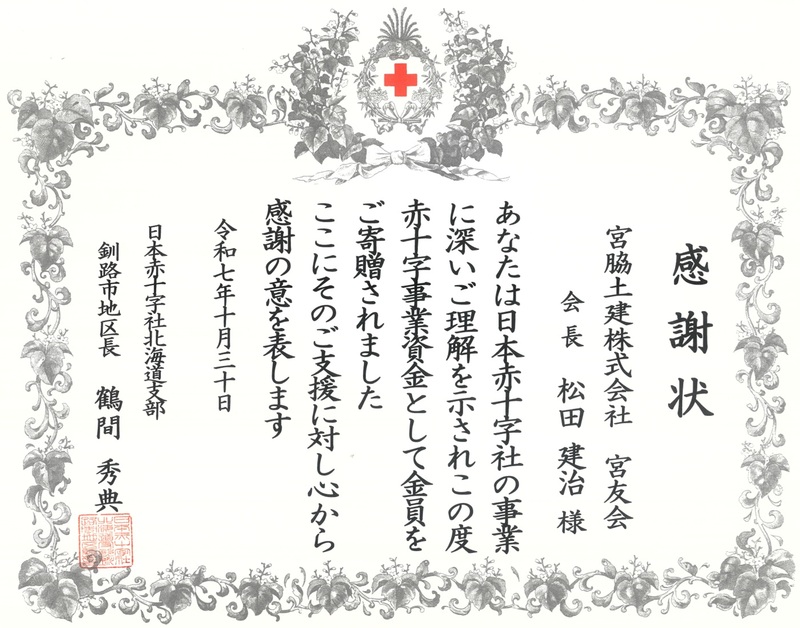 日本赤十字社北海道支部殿より感謝状をいただきました