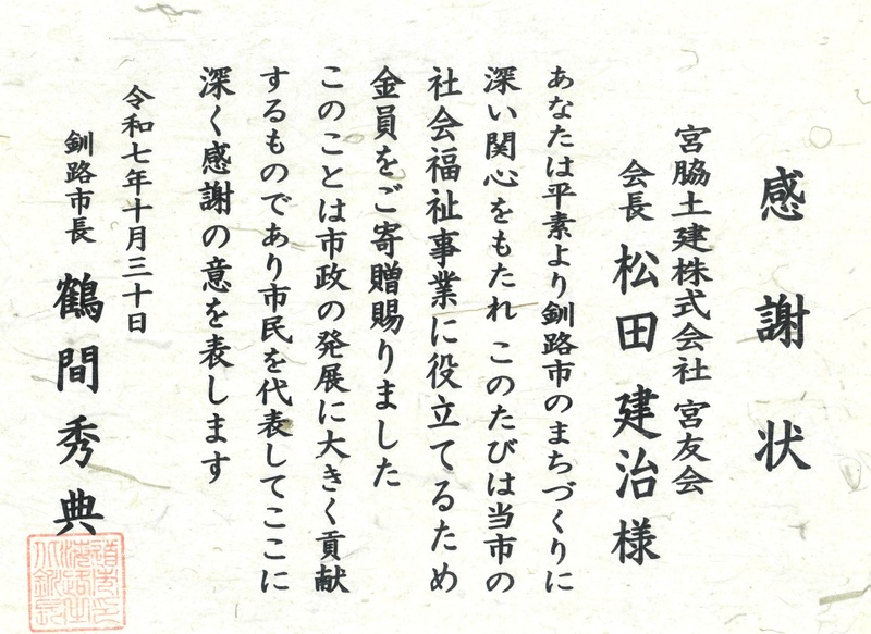 釧路市殿より感謝状をいただきました